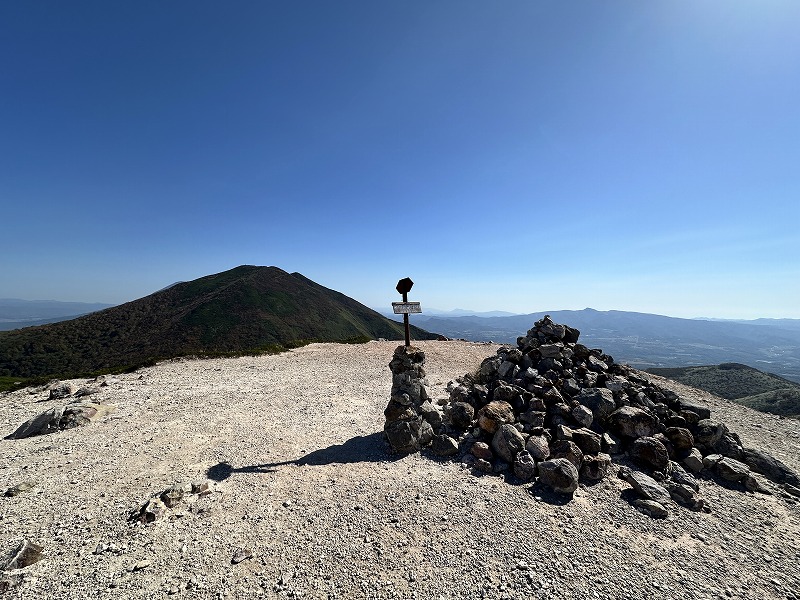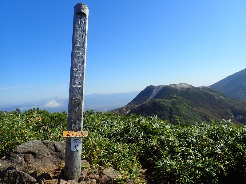 登山口から約1時間でニトヌプリ登頂。次の目的地のイワオヌプリを望みます。