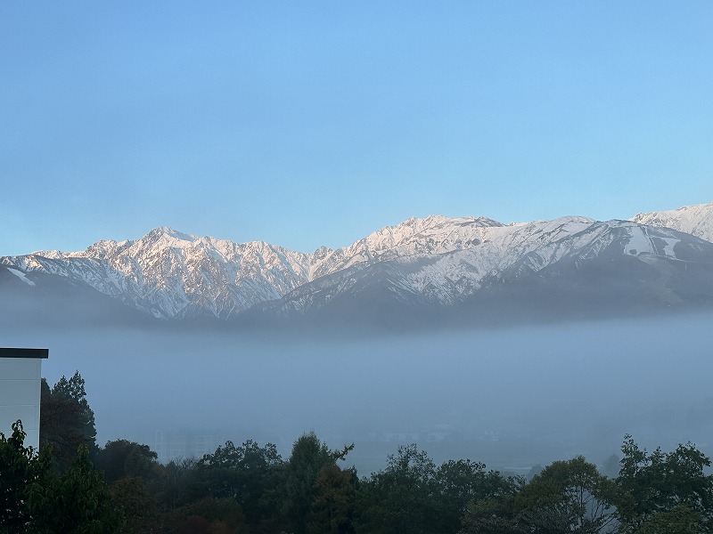 翌朝は霧に浮かぶ朝日に照らされる唐松岳、五竜岳が望めました。