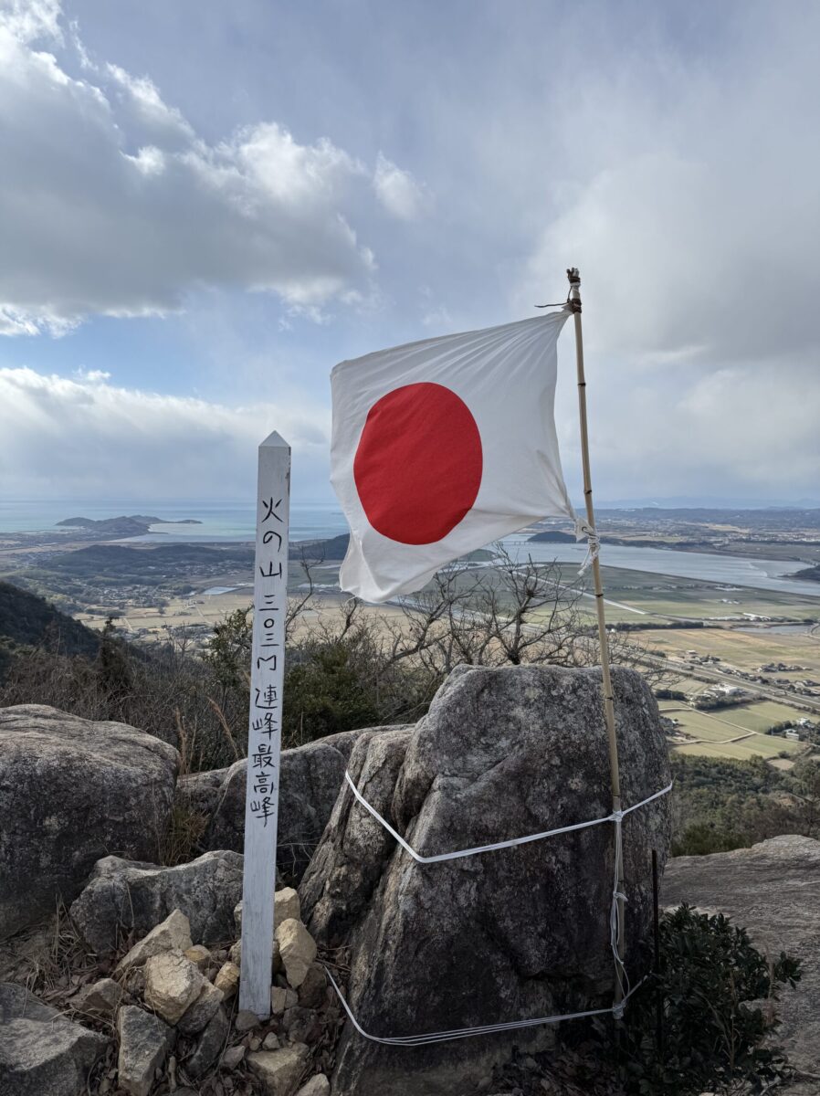 火の山山頂、日の丸が印象的でした。陶ヶ岳山頂も寒さ厳しいですが、景色はご褒美!!!