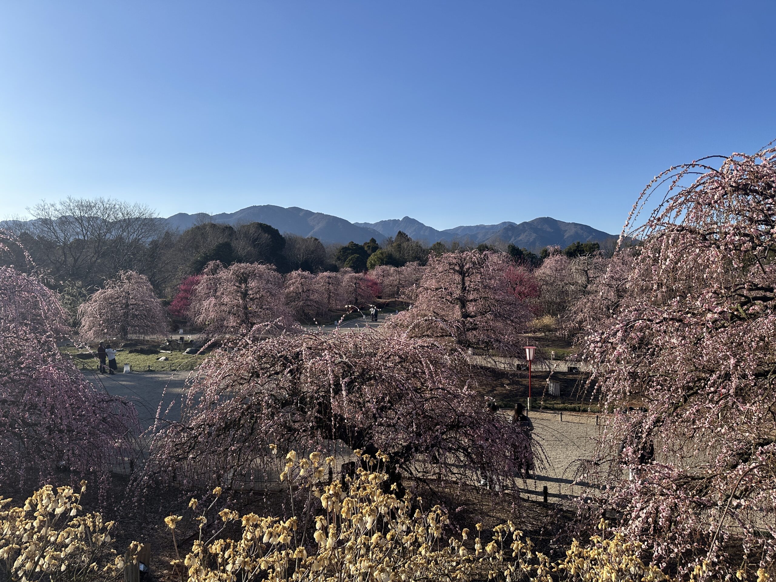 鈴鹿の森庭園のしだれ梅はすでに見頃が過ぎて、終盤になっていましたが、それでもとてもきれいでした。夜にはライトアップもされてとても幻想的な光景になるそうです。なので、来年ぜひ1泊2日で夜のライトアップを見に行くツアーを企画したいなと思っています。興味ある!という方はぜひお問い合わせください(^^♪