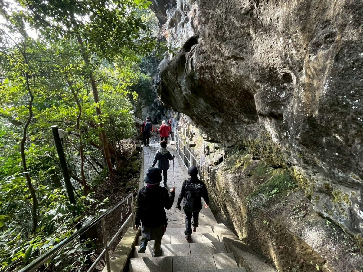 午後からお待ちかねの鋸山へ。ほとんどの皆さんは鋸山に行きたかった~と。今日は人も少なく静かな鋸山を歩きました。まだところどころ紅葉も見る事もできて巨岩の間へ。江戸時代から盛んに採石が行われたそうです。