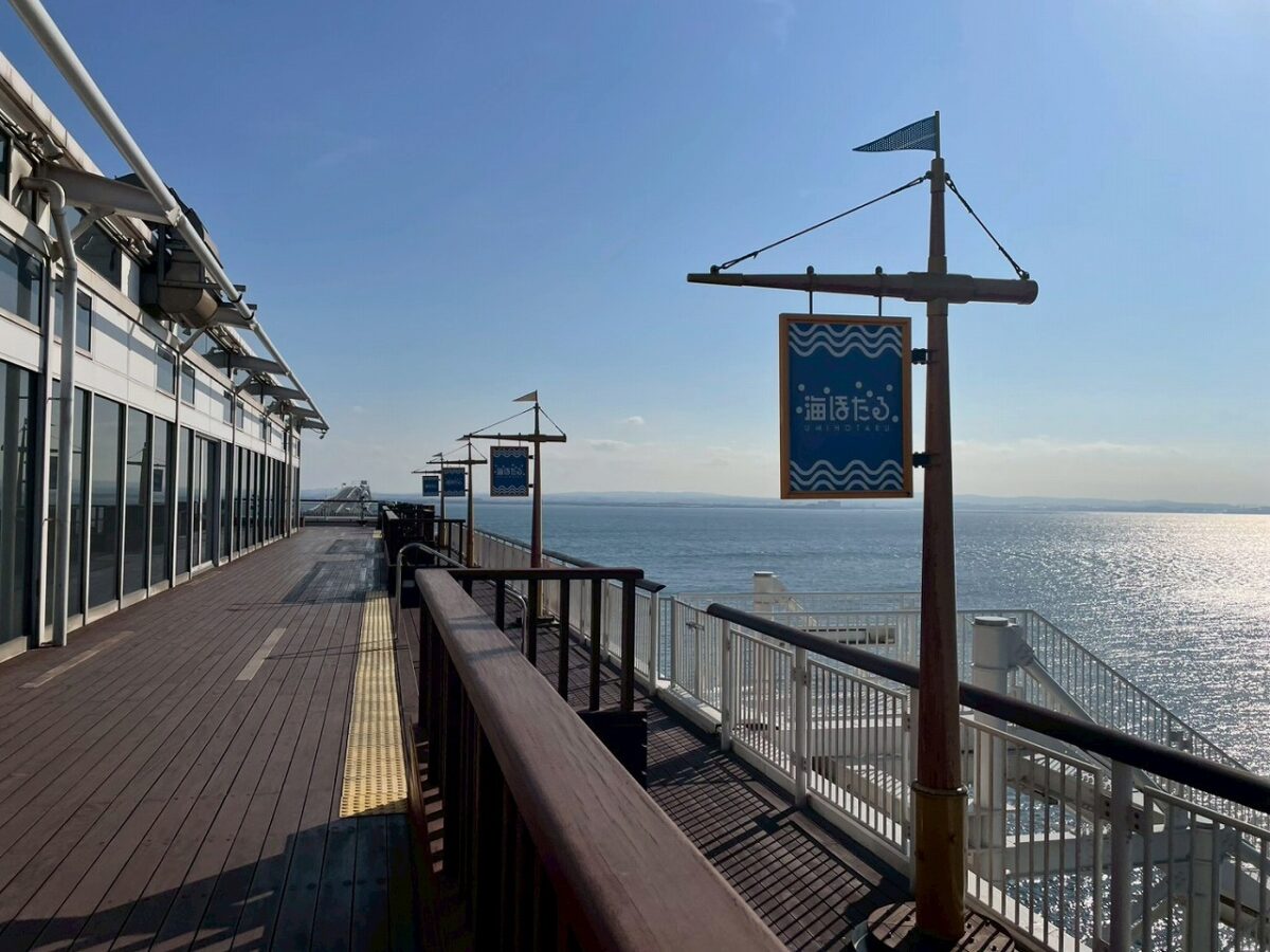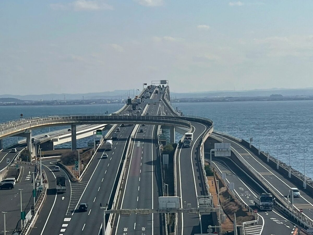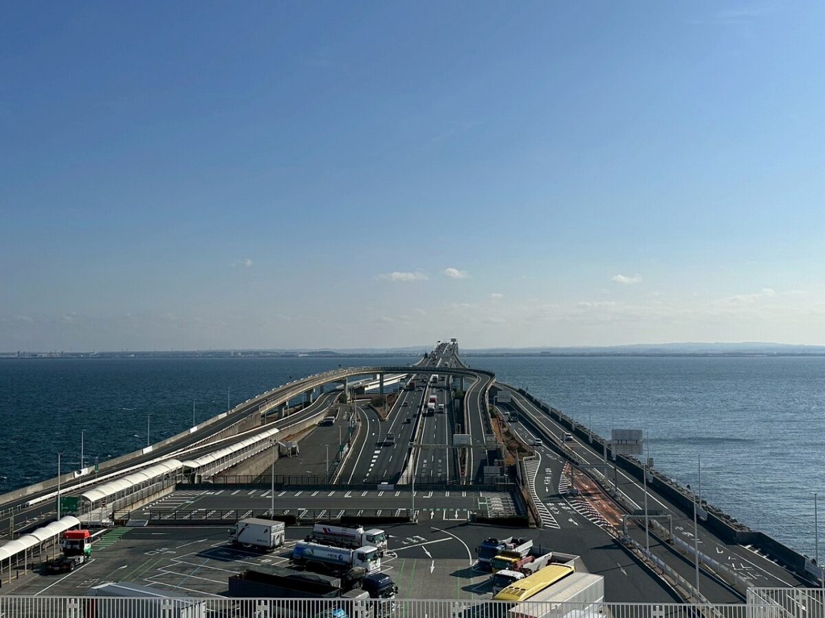 とっても景色のいい海に浮かぶサービスエリアの海ほたる。キラキラ輝く海いいところですね。