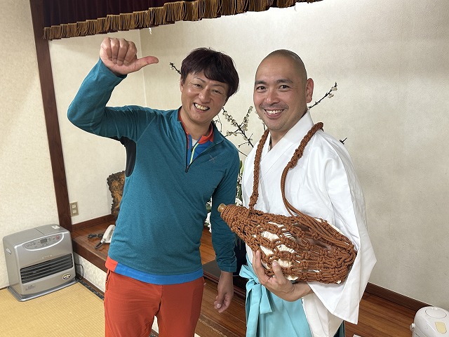 そこに、お祭りで超お忙しい中、英彦山神宮の禰宜さん(ガイド高千穂さんの従兄弟さん)が来られて、英彦山のお話とホラ貝の演奏を。まさに高千穂ガイドならではの、唯一無二の旅ですね♪