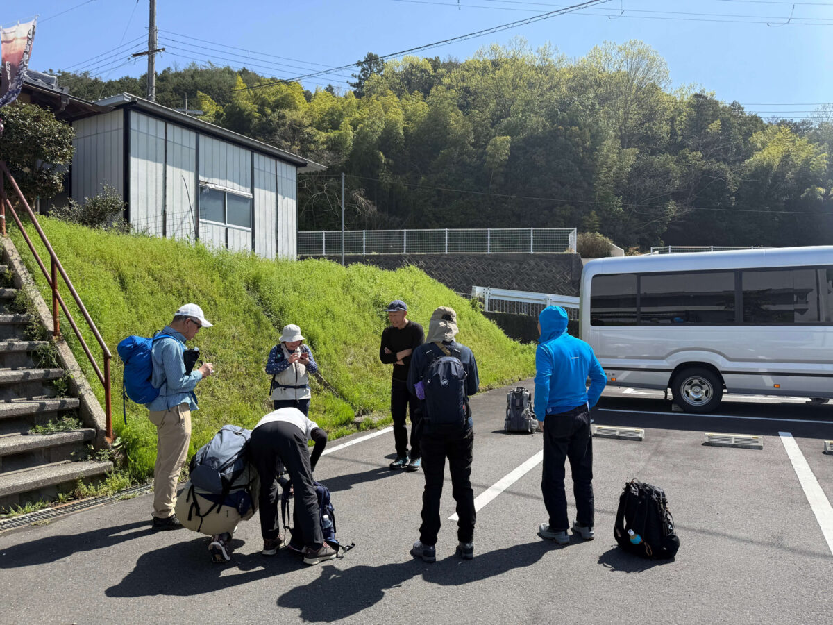 黒井城跡駐車場にて登山準備。