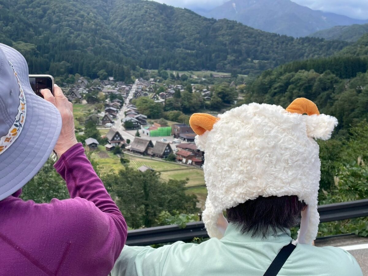 ひつじの帽子をかぶって白川郷を眺める皆様(笑笑笑)。どこに行ってもいつも笑顔でにぎやかでとってもお茶目な皆様。これからもいつまでもお元気でずっ~~とご一緒しましょうね。武村ガイド、ご参加の皆様ありがとうございました。