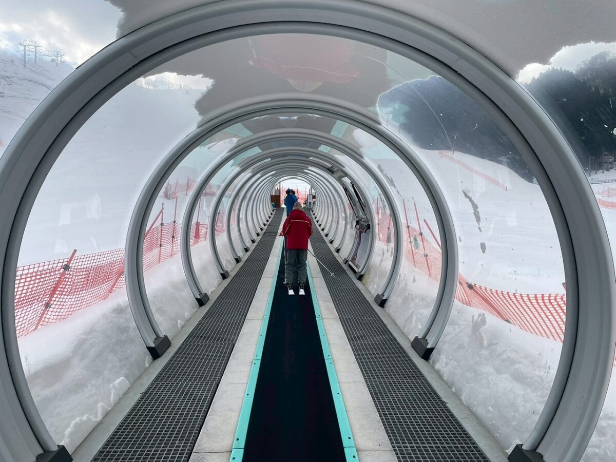 最高のゲレンデコンディション、いよいよスキースタートです。板をつけたまま立って乗れる「楽ちんベルト」でらくらく移動。