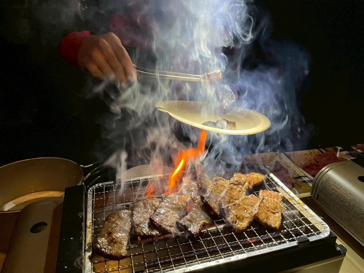 山内ガイドが野菜やお肉などを丁寧に焼いてくれます。