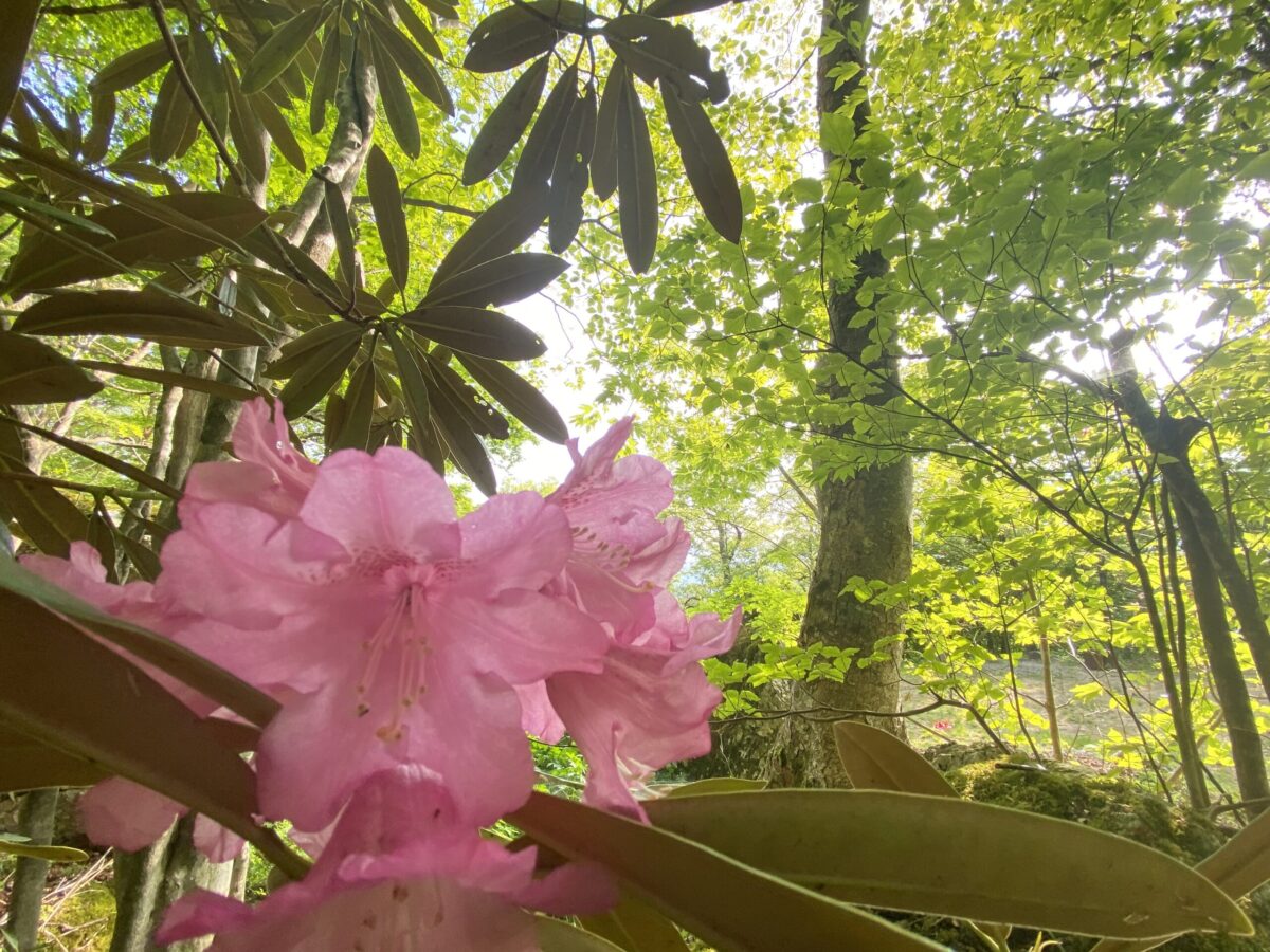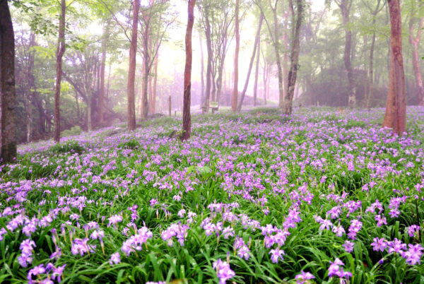 新緑の森と斜面を埋め尽くす花々。岳人の森のオーナーが一番愛している風景 日本最大級ヒメシャガ大群落。