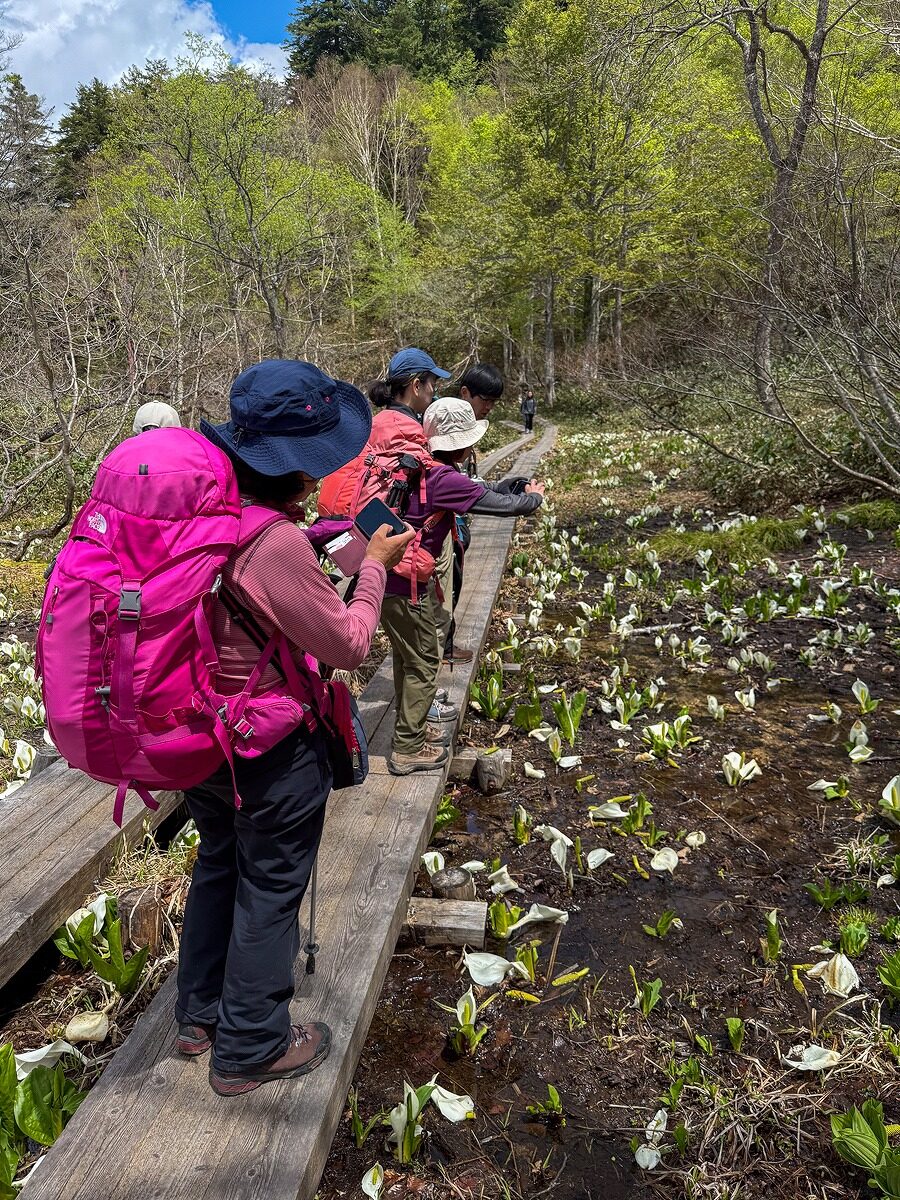 まだ残雪のあるこの時期、雪解けの間から顔を出すとても小さくて愛らしい水芭蕉。手のひらほどの大きさで、花(額)は目の覚めるような純白。そんな水芭蕉の花が湿原いっぱいに咲き乱れます。実は尾瀬の水芭蕉が一番美しいのはこの咲き始めの時期なのです。贅沢な時間を楽しみながらも尾瀬の魅力を余すところなく全部歩く全周コースです。