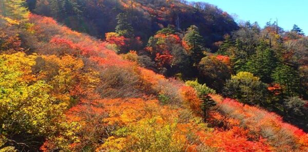 緑の稜線の山裾を染める美しい紅葉が見られる秋。