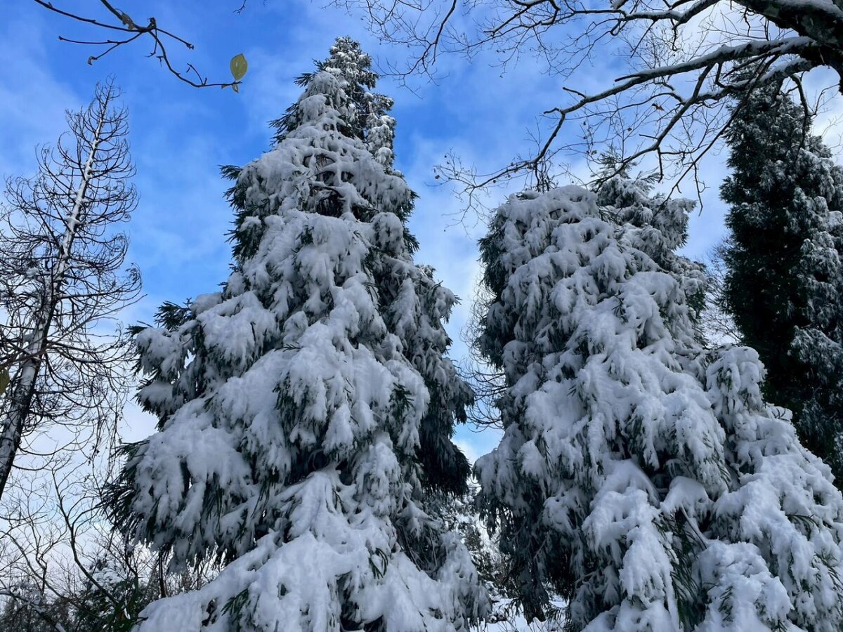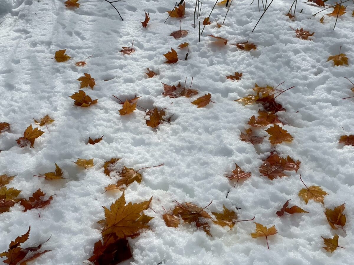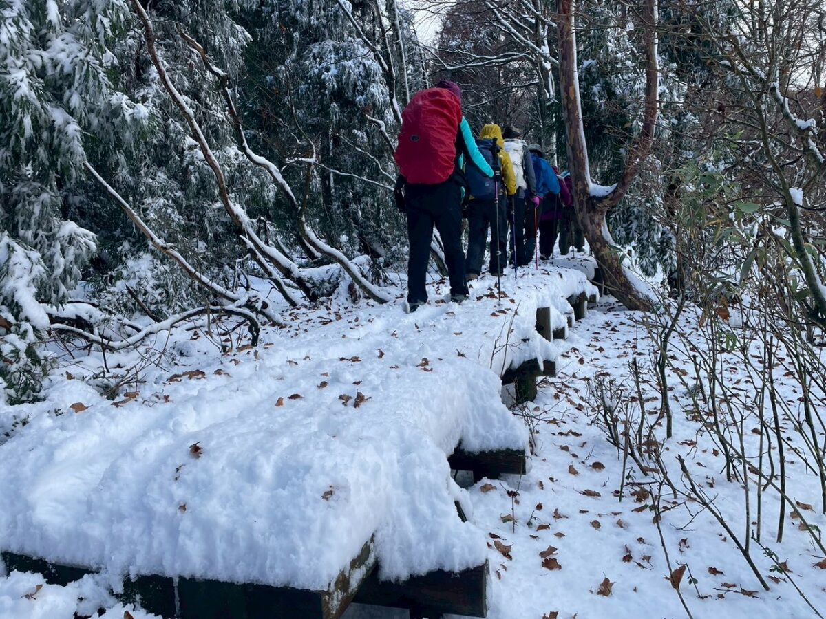 登山口からいきなり素晴らしい世界に。一足早い今日はクリスマスのようなツリーも!! 急な雪でしょうね、降った後に落葉が散ってのもいい感じですね。